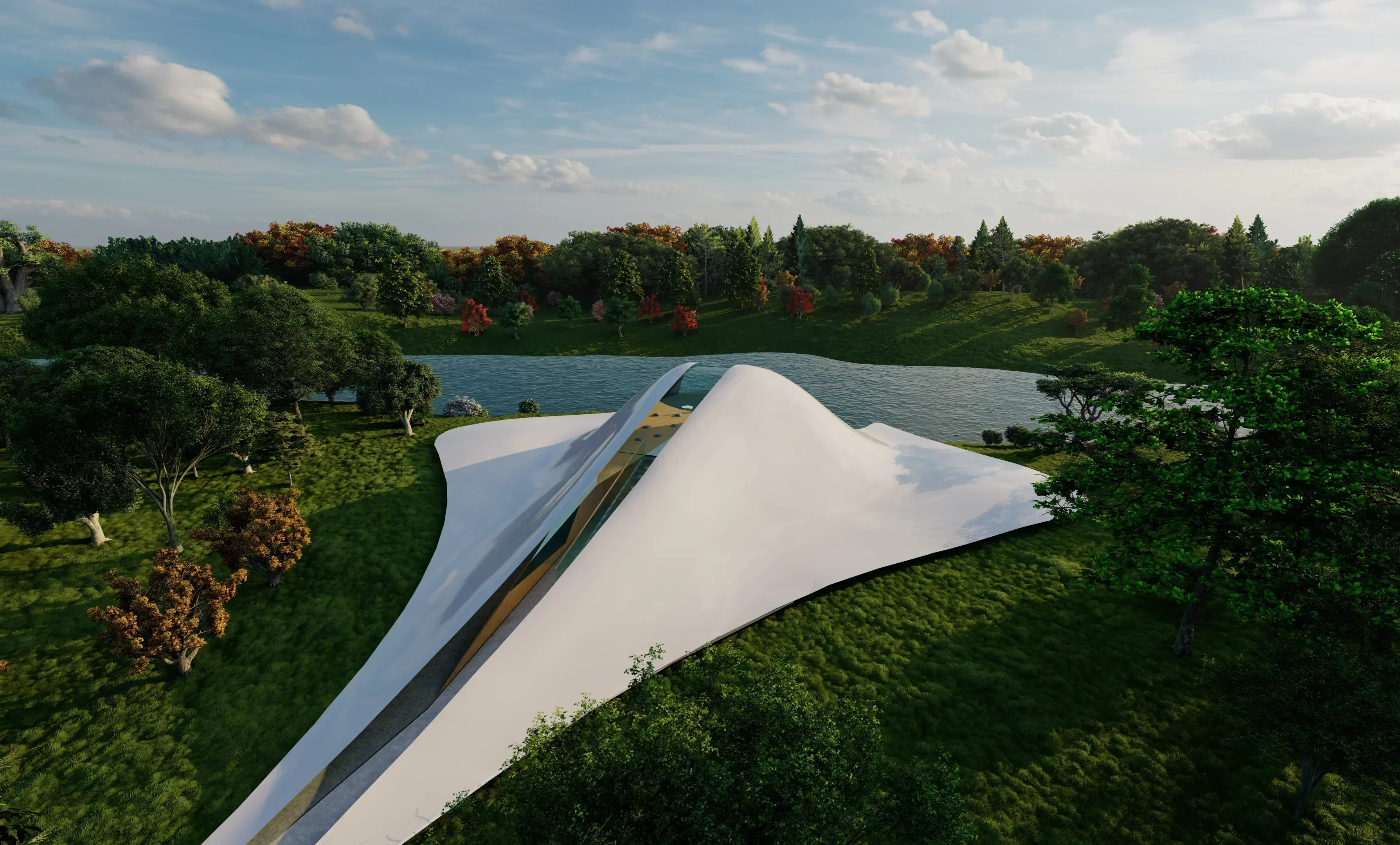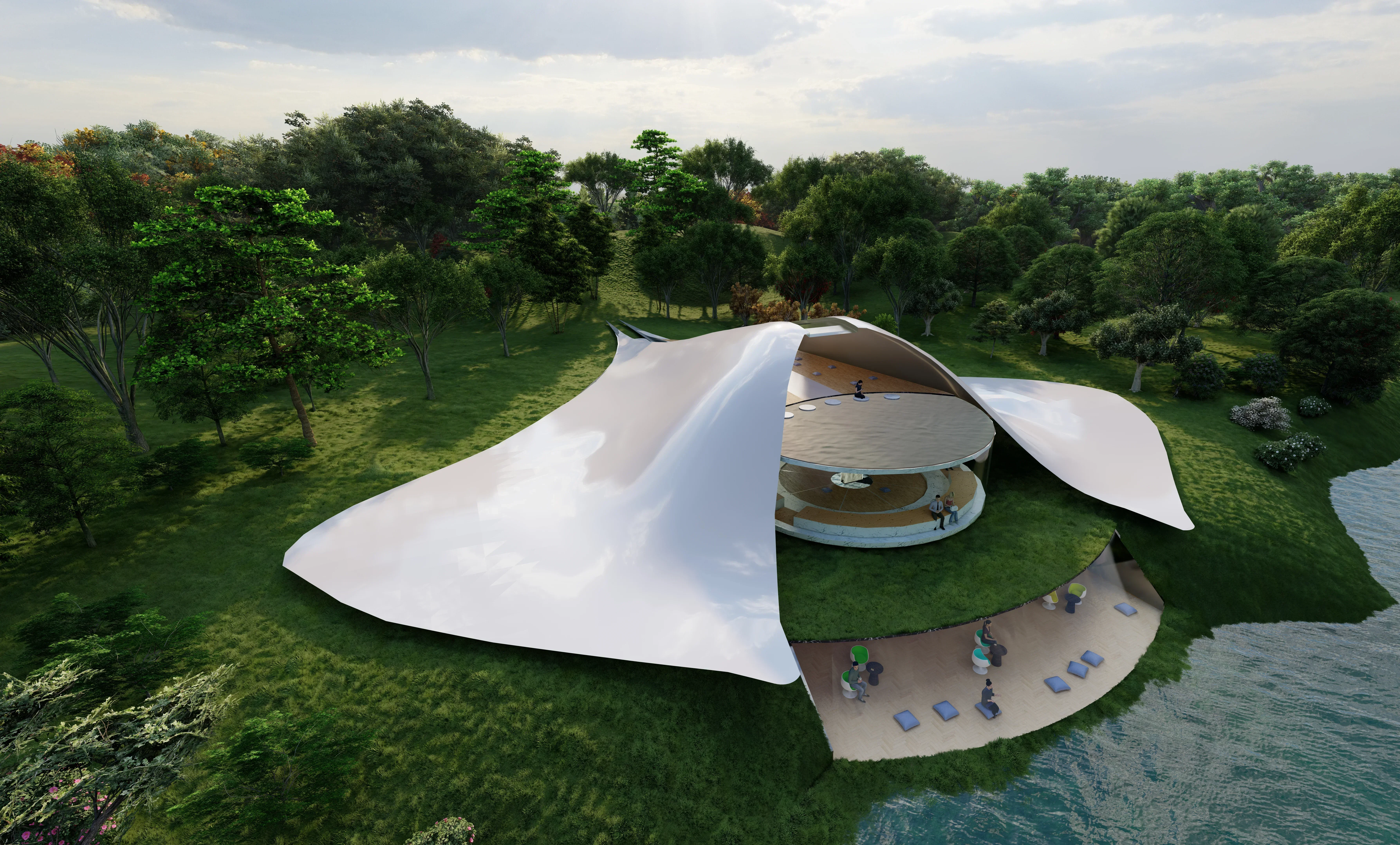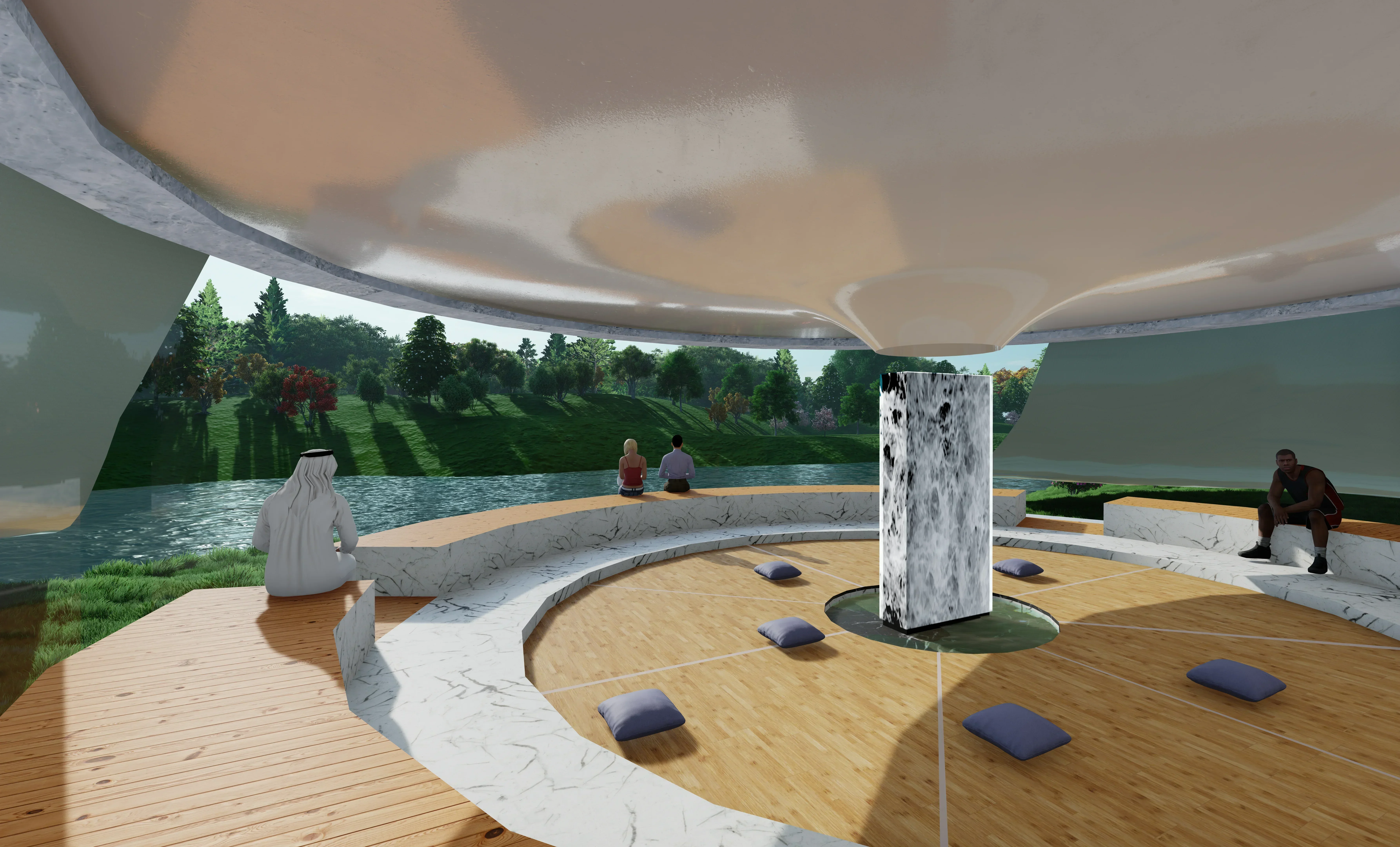 During quaranteeing and studying-at-home, I have increasingly realized the importance of 'going out into nature" and into the woods. The design of this piece of architecture, residing by the riverside of the Central Park in New York, is to provide busy city-dwellers a place for calming mindfulness and valuable reflections.